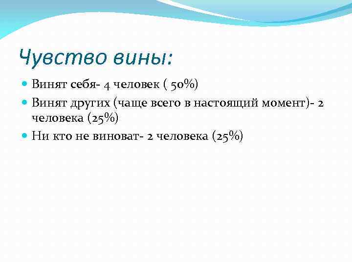 Чувство вины: Винят себя- 4 человек ( 50%) Винят других (чаще всего в настоящий момент)- 2 человека (25%) Ни кто не виноват- 2 человека (25%)