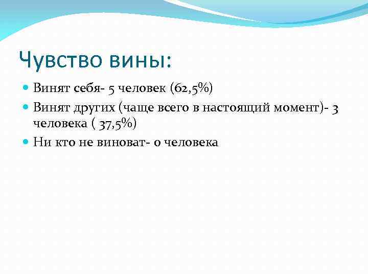 Чувство вины: Винят себя- 5 человек (62, 5%) Винят других (чаще всего в настоящий момент)- 3 человека ( 37, 5%) Ни кто не виноват- 0 человека