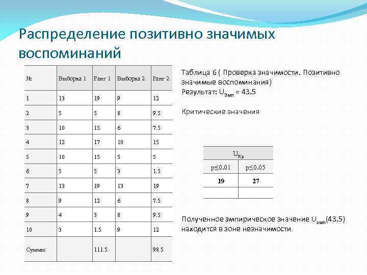 Распределение позитивно значимых воспоминаний № Выборка 1 Ранг 1 Выборка 2 Ранг 2 1 13 19 9 12 2 5 5 8 9. 5 3 10 15 6 7. 5 4 12 17 10 15 5 5 6 5 5 3 1. 5 7 13 19 8 9 12 6 7. 5 9 4 3 8 9. 5 10 3 1. 5 9 12 Суммы: 111. 5 98. 5 Таблица 6 ( Проверка значимости. Позитивно значимые воспоминания) Результат: UЭмп = 43. 5 Критические значения UКр p≤ 0. 01 p≤ 0. 05 19 27 Полученное эмпирическое значение Uэмп(43. 5) находится в зоне незначимости.