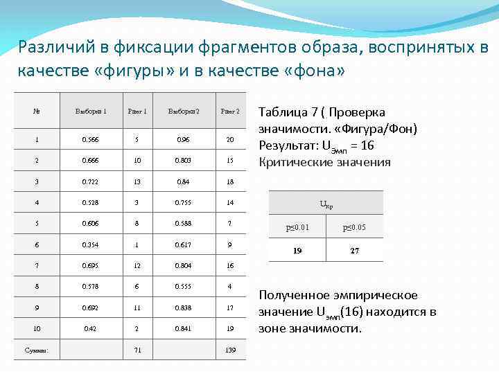 Различий в фиксации фрагментов образа, воспринятых в качестве «фигуры» и в качестве «фона» № Выборка 1 Ранг 1 Выборка 2 Ранг 2 1 0. 566 5 0. 96 20 2 0. 666 10 0. 803 15 3 0. 722 13 0. 84 18 4 0. 528 3 0. 755 14 5 0. 606 8 0. 588 7 6 0. 354 1 0. 617 9 7 0. 695 12 0. 804 16 8 0. 578 6 0. 555 4 9 0. 692 11 0. 838 17 10 0. 42 2 0. 841 19 Суммы: 71 139 Таблица 7 ( Проверка значимости. «Фигура/Фон) Результат: UЭмп = 16 Критические значения UКр p≤ 0. 01 p≤ 0. 05 19 27 Полученное эмпирическое значение Uэмп(16) находится в зоне значимости.