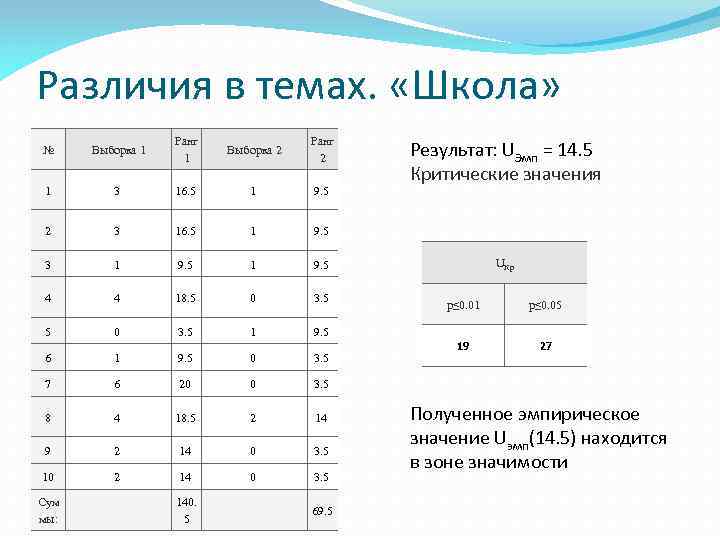 Различия в темах. «Школа» № Выборка 1 Ранг 1 Выборка 2 Ранг 2 1 3 16. 5 1 9. 5 2 3 16. 5 1 9. 5 3 1 9. 5 4 4 18. 5 0 3. 5 5 0 3. 5 1 9. 5 6 1 9. 5 0 3. 5 7 6 20 0 3. 5 8 4 18. 5 2 14 9 2 14 0 3. 5 10 2 14 0 3. 5 Сум мы: 140. 5 69. 5 Результат: UЭмп = 14. 5 Критические значения UКр p≤ 0. 01 p≤ 0. 05 19 27 Полученное эмпирическое значение Uэмп(14. 5) находится в зоне значимости