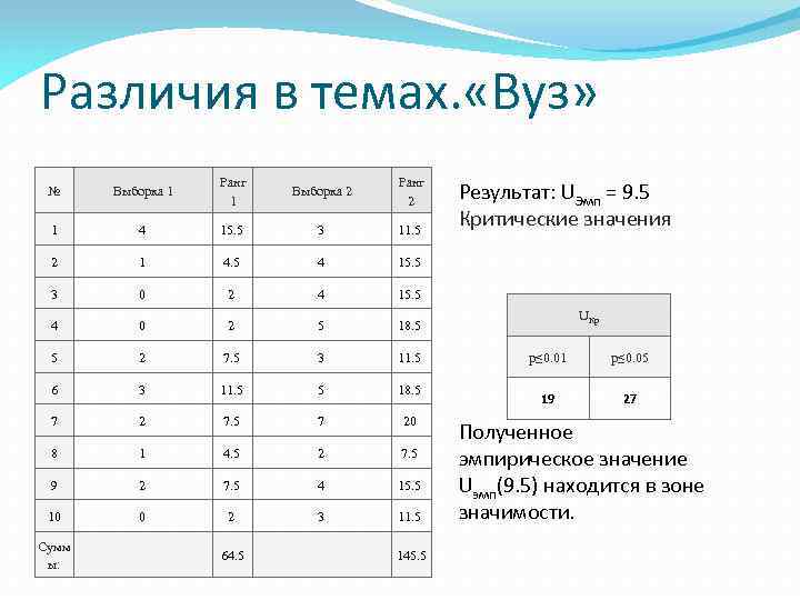 Различия в темах. «Вуз» № Выборка 1 Ранг 1 Выборка 2 Ранг 2 1 4 15. 5 3 11. 5 2 1 4. 5 4 15. 5 3 0 2 4 15. 5 4 0 2 5 18. 5 5 2 7. 5 3 11. 5 6 3 11. 5 5 18. 5 7 2 7. 5 7 20 8 1 4. 5 2 7. 5 9 2 7. 5 4 15. 5 10 0 2 3 11. 5 Сумм ы: 64. 5 145. 5 Результат: UЭмп = 9. 5 Критические значения UКр p≤ 0. 01 p≤ 0. 05 19 27 Полученное эмпирическое значение Uэмп(9. 5) находится в зоне значимости.