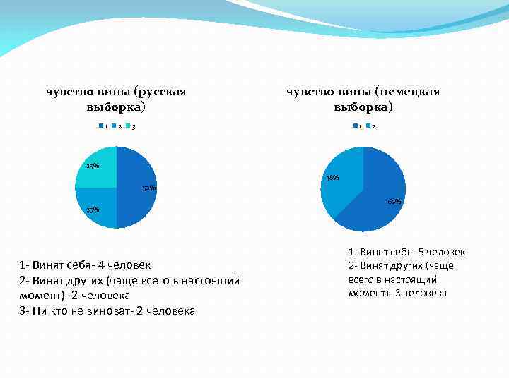 чувство вины (русская выборка) 1 2 чувство вины (немецкая выборка) 3 1 2 25% 38% 50% 25% 1 - Винят себя- 4 человек 2 - Винят других (чаще всего в настоящий момент)- 2 человека 3 - Ни кто не виноват- 2 человека 62% 1 - Винят себя- 5 человек 2 - Винят других (чаще всего в настоящий момент)- 3 человека