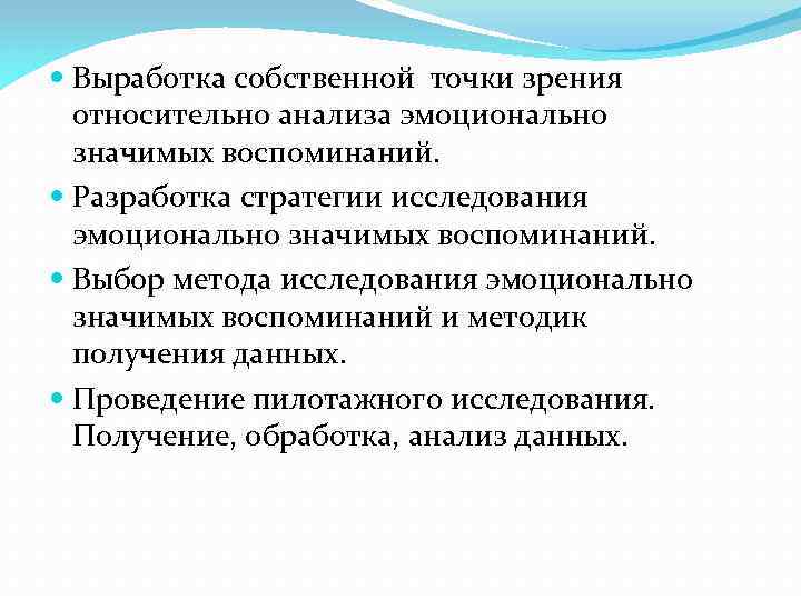 Выработка собственной точки зрения относительно анализа эмоционально значимых воспоминаний. Разработка стратегии исследования эмоционально значимых воспоминаний. Выбор метода исследования эмоционально значимых воспоминаний и методик получения данных. Проведение пилотажного исследования. Получение, обработка, анализ данных.