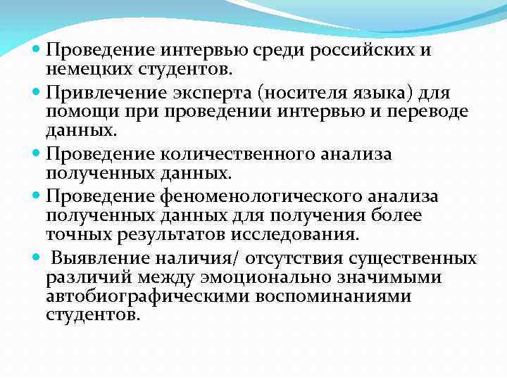 Проведение интервью среди российских и немецких студентов. Привлечение эксперта (носителя языка) для помощи проведении интервью и переводе данных. Проведение количественного анализа полученных данных. Проведение феноменологического анализа полученных данных для получения более точных результатов исследования. Выявление наличия/ отсутствия существенных различий между эмоционально значимыми автобиографическими воспоминаниями студентов.
