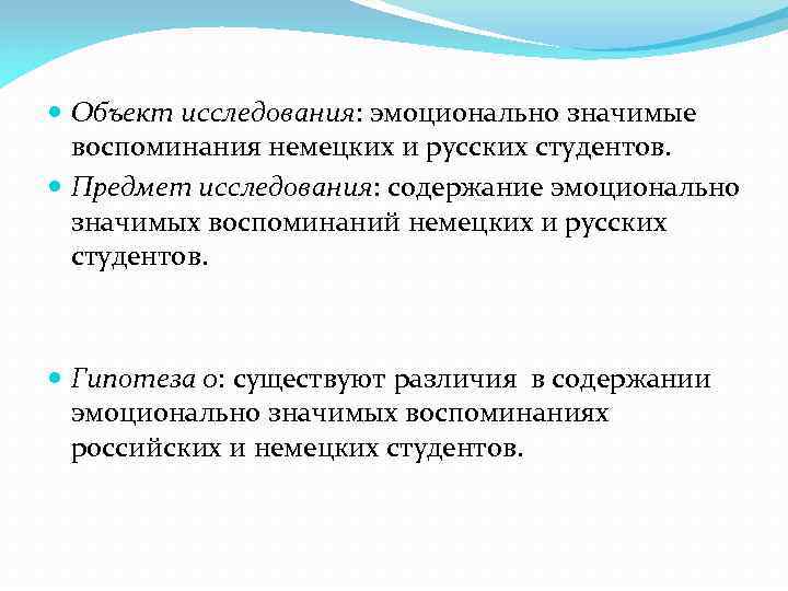 Объект исследования: эмоционально значимые воспоминания немецких и русских студентов. Предмет исследования: содержание эмоционально значимых воспоминаний немецких и русских студентов. Гипотеза 0: существуют различия в содержании эмоционально значимых воспоминаниях российских и немецких студентов.