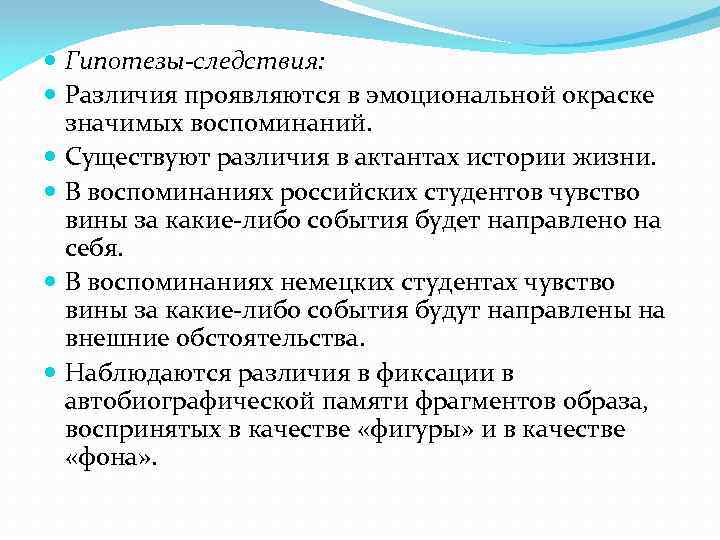 Гипотезы-следствия: Различия проявляются в эмоциональной окраске значимых воспоминаний. Существуют различия в актантах истории жизни. В воспоминаниях российских студентов чувство вины за какие-либо события будет направлено на себя. В воспоминаниях немецких студентах чувство вины за какие-либо события будут направлены на внешние обстоятельства. Наблюдаются различия в фиксации в автобиографической памяти фрагментов образа, воспринятых в качестве «фигуры» и в качестве «фона» .