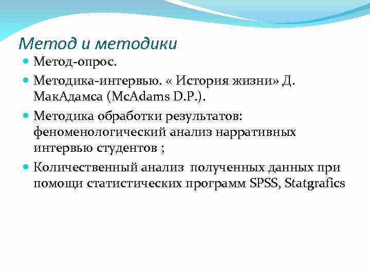 Метод и методики Метод-опрос. Методика-интервью. « История жизни» Д. Мак. Адамса (Mc. Adams D. P. ). Методика обработки результатов: феноменологический анализ нарративных интервью студентов ; Количественный анализ полученных данных при помощи статистических программ SPSS, Statgrafics