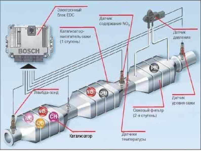 На дизельных двигателях применяется сажевый фильтр, который обеспечивает снижение выброса сажи в атмосферу с отработавшими газами. В выпускной системе сажевый фильтр может быть объединен с каталитическим нейтрализатором