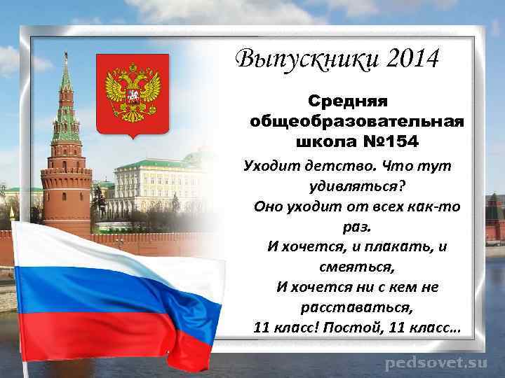 Выпускники 2014 Средняя общеобразовательная школа № 154 Уходит детство. Что тут удивляться? Оно уходит от всех как-то раз. И хочется, и плакать, и смеяться, И хочется ни с кем не расставаться, 11 класс! Постой, 11 класс…