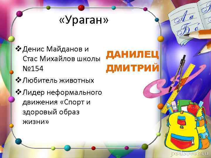 «Ураган» v Денис Майданов и Стас Михайлов школы ДАНИЛЕЦ № 154 ДМИТРИЙ v Любитель животных v Лидер неформального движения «Спорт и здоровый образ жизни»