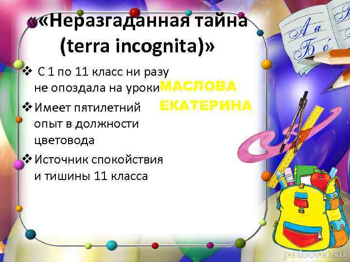 « «Неразгаданная тайна (terra incognita)» v С 1 по 11 класс ни разу не опоздала на уроки. МАСЛОВА v Имеет пятилетний ЕКАТЕРИНА опыт в должности цветовода v Источник спокойствия и тишины 11 класса
