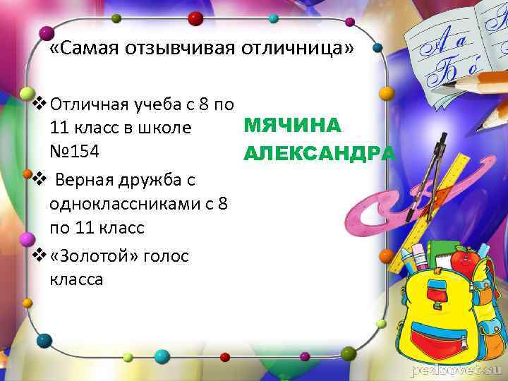 «Самая отзывчивая отличница» v Отличная учеба с 8 по МЯЧИНА 11 класс в школе № 154 АЛЕКСАНДРА v Верная дружба с одноклассниками с 8 по 11 класс v «Золотой» голос класса