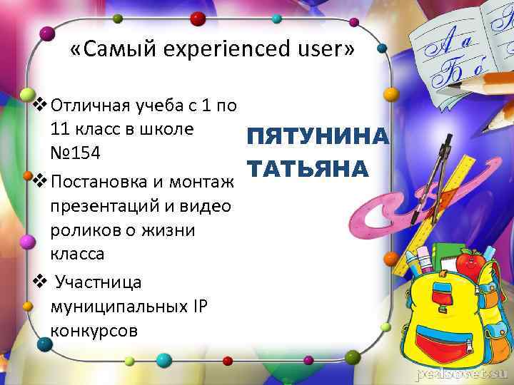 «Самый experienced user» v Отличная учеба с 1 по 11 класс в школе ПЯТУНИНА № 154 ТАТЬЯНА v Постановка и монтаж презентаций и видео роликов о жизни класса v Участница муниципальных IP конкурсов