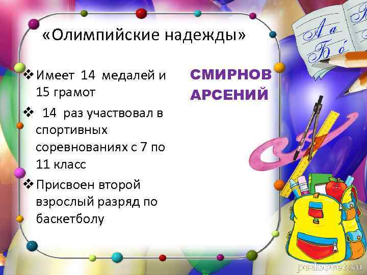 «Олимпийские надежды» v Имеет 14 медалей и 15 грамот v 14 раз участвовал в спортивных соревнованиях с 7 по 11 класс v Присвоен второй взрослый разряд по баскетболу СМИРНОВ АРСЕНИЙ