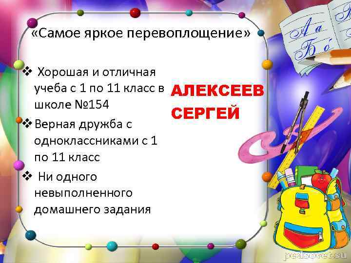 «Самое яркое перевоплощение» v Хорошая и отличная учеба с 1 по 11 класс в АЛЕКСЕЕВ школе № 154 СЕРГЕЙ v Верная дружба с одноклассниками с 1 по 11 класс v Ни одного невыполненного домашнего задания