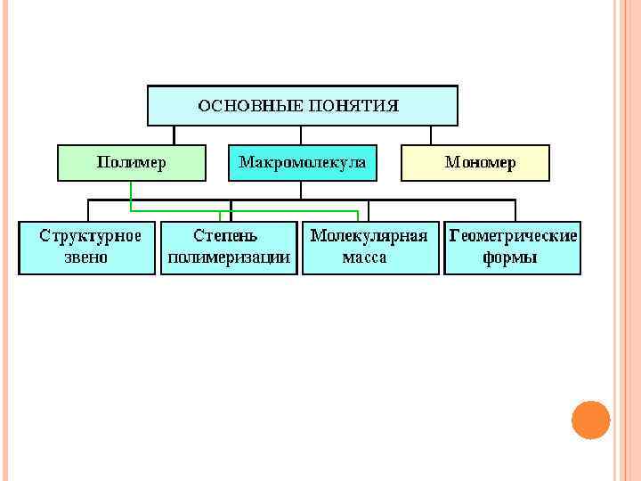 ОСНОВНЫЕ ПОНЯТИЯ Для характеристики высокомолекулярных соединений необходимо рассмотреть следующие понятия: полимер макромолекула мономер структурное звено макромолекулы степень полимеризации макромолекулы молекулярная масса полимера геометрические формы макромолекул