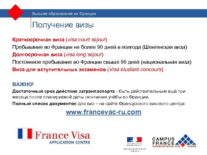 Высшее образование во Франции Получение визы Краткосрочная виза (visa court séjour) Пребывание во Франции не более 90 дней в полгода (Шенгенская виза) Долгосрочная виза (visa long séjour) Постоянное пребывание во Франции свыше 90 дней (национальная виза) Виза для вступительных экзаменов (Visa étudiant concours) ВАЖНО! Достаточный срок действия загранпаспорта - быть действительным ещё три месяца после планируемой даты окончания учёбы во Франции. Полный список документов для виз – на сайте Французского визового центра www. francevac-ru. com