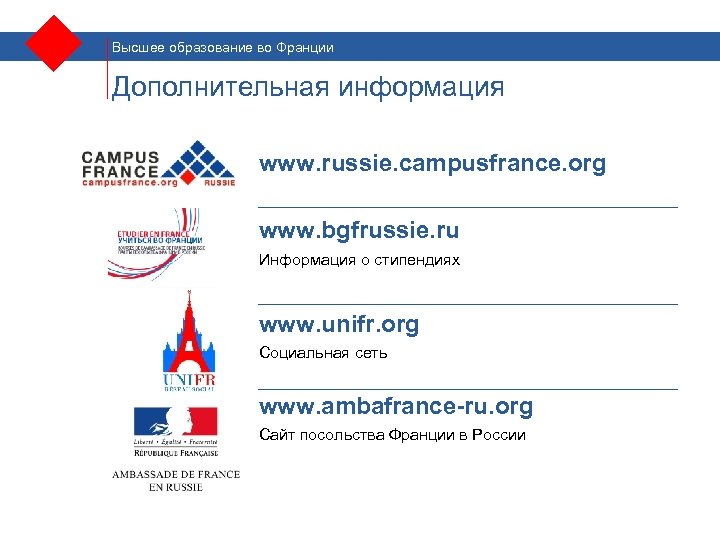 Высшее образование во Франции Дополнительная информация www. russie. campusfrance. org www. bgfrussie. ru Информация о стипендиях www. unifr. org Социальная сеть www. ambafrance-ru. org Сайт посольства Франции в России