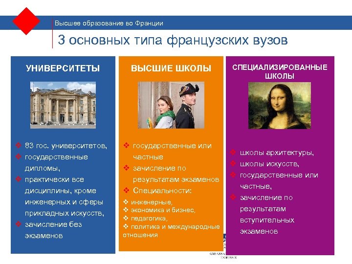 Высшее образование во Франции 3 основных типа французских вузов УНИВЕРСИТЕТЫ ВЫСШИЕ ШКОЛЫ v 83 гос. университетов, v государственные дипломы, v практически все дисциплины, кроме инженерных и сферы прикладных искусств, v зачисление без экзаменов v государственные или частные v зачисление по результатам экзаменов v Специальности: СПЕЦИАЛИЗИРОВАННЫЕ ШКОЛЫ v школы архитектуры, v школы искусств, v государственные или частные, v зачисление по v инженерные, результатам v экономика и бизнес, v педагогика, вступительных v политика и международные экзаменов отношения