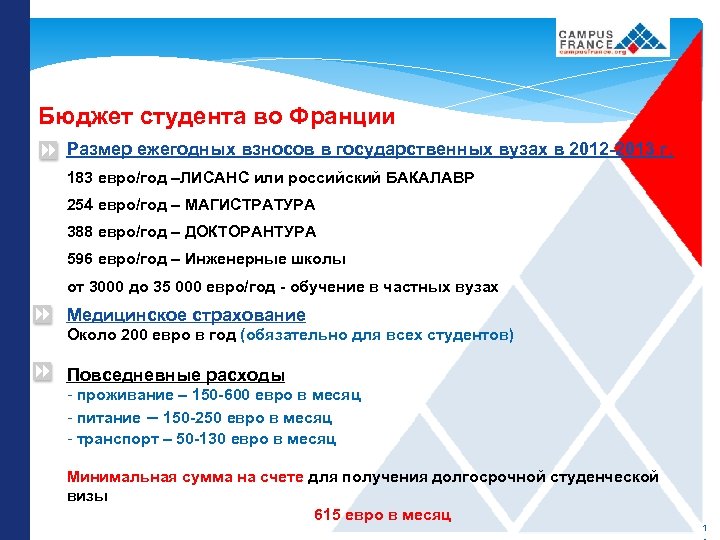 Бюджет студента во Франции Размер ежегодных взносов в государственных вузах в 2012 -2013 г. 183 евро/год –ЛИСАНС или российский БАКАЛАВР 254 евро/год – МАГИСТРАТУРА 388 евро/год – ДОКТОРАНТУРА 596 евро/год – Инженерные школы от 3000 до 35 000 евро/год - обучение в частных вузах Медицинское страхование Около 200 евро в год (обязательно для всех студентов) Повседневные расходы - проживание – 150 -600 евро в месяц - питание – 150 -250 евро в месяц - транспорт – 50 -130 евро в месяц Минимальная сумма на счете для получения долгосрочной студенческой визы 615 евро в месяц 1