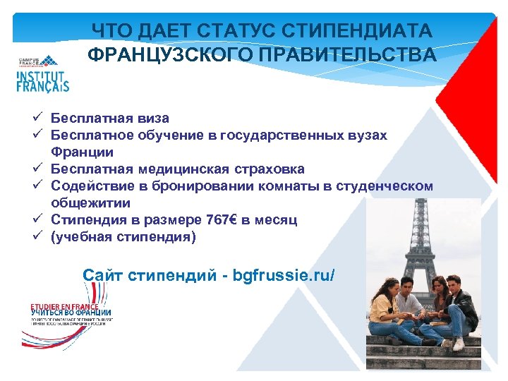 ЧТО ДАЕТ СТАТУС СТИПЕНДИАТА ФРАНЦУЗСКОГО ПРАВИТЕЛЬСТВА ü Бесплатная виза ü Бесплатное обучение в государственных вузах Франции ü Бесплатная медицинская страховка ü Содействие в бронировании комнаты в студенческом общежитии ü Стипендия в размере 767€ в месяц ü (учебная стипендия) Сайт стипендий - bgfrussie. ru/