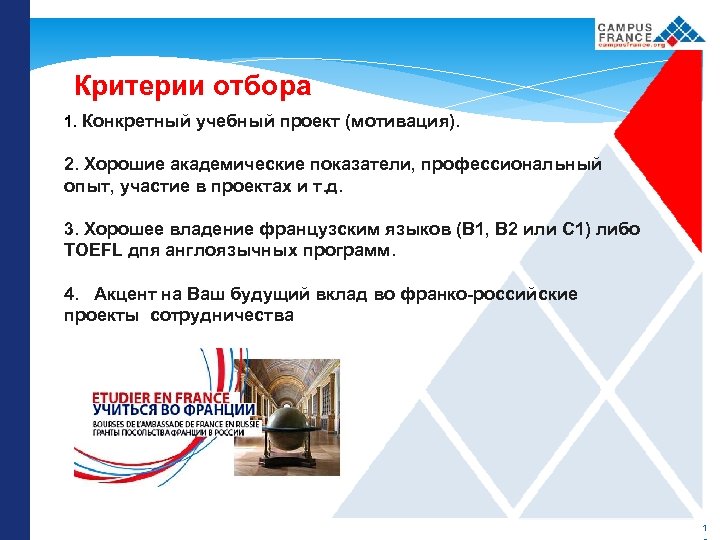 Критерии отбора 1. Конкретный учебный проект (мотивация). 2. Хорошие академические показатели, профессиональный опыт, участие в проектах и т. д. 3. Хорошее владение французским языков (B 1, B 2 или C 1) либо TOEFL дпя англоязычных программ. 4. Акцент на Ваш будущий вклад во франко-российские проекты сотрудничества 1