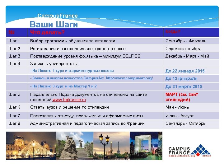 Campus. France Ваши Шаги Что делать? Когда? Шаг 1 Выбор программы обучения по каталогам Сентябрь - Февраль Шаг 2 Регистрация и заполнение электронного досье Середина ноября Шаг 3 Подтверждение уровня фр. языка – минимум DELF B 2 Декабрь - Март - Май № – Шаг 4 Запись в университеты : - На Лисанс 1 курс и в архитектурные школы До 22 января 2015 - Запись в школы искусства Campus. Art http: //www. campusart. org/ До 12 февраля - На Лисанс 3 курс и на Мастер 1 и 2 До 31 марта 2015 Шаг 5 Параллельно Подача документов на стипендию на сайте стипендий www. bgfrussie. ru МАРТ (см. сайт стипендий) Шаг 6 Ответы вузов и решение по стипендии Май - Июнь Шаг 7 Подготовка к отъезду: поиск жилья и оформление визы Июль - Август Шаг 8 Административная и педагогическая запись во Франции Сентябрь - Октябрь