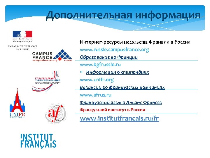 Дополнительная информация Интернет-ресурсы Посольства Франции в России www. russie. campusfrance. org Образование во Франции www. bgfrussie. ru Информация о стипендиях www. unifr. org Вакансии во французских компаниях www. afrus. ru Французский язык в Альянс Франсез Французский институт в России www. institutfrancais. ru/fr