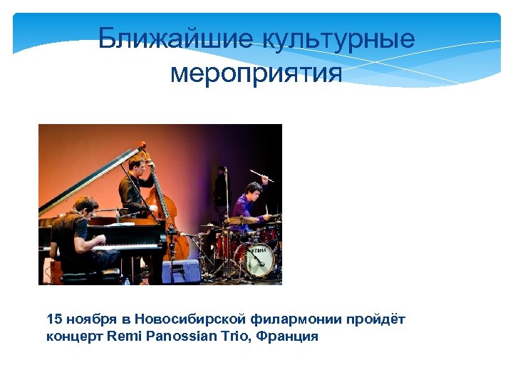 Ближайшие культурные мероприятия 15 ноября в Новосибирской филармонии пройдёт концерт Remi Panossian Trio, Франция