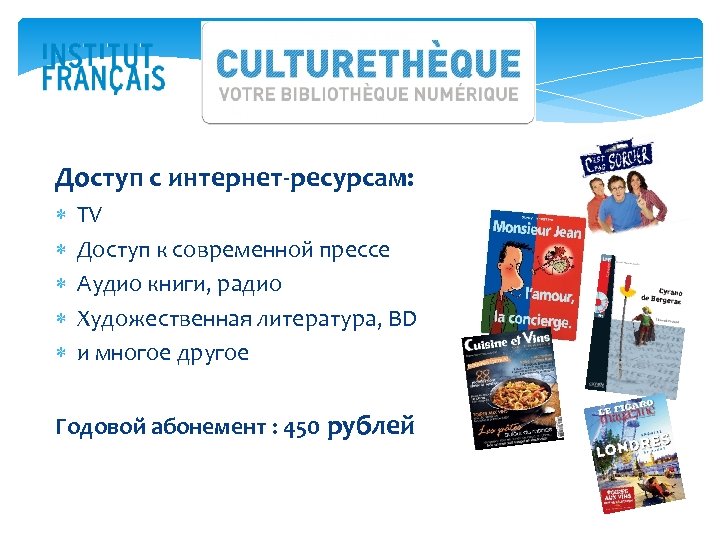 Доступ с интернет-ресурсам: TV Доступ к современной прессе Аудио книги, радио Художественная литература, BD и многое другое Годовой абонемент : 450 рублей