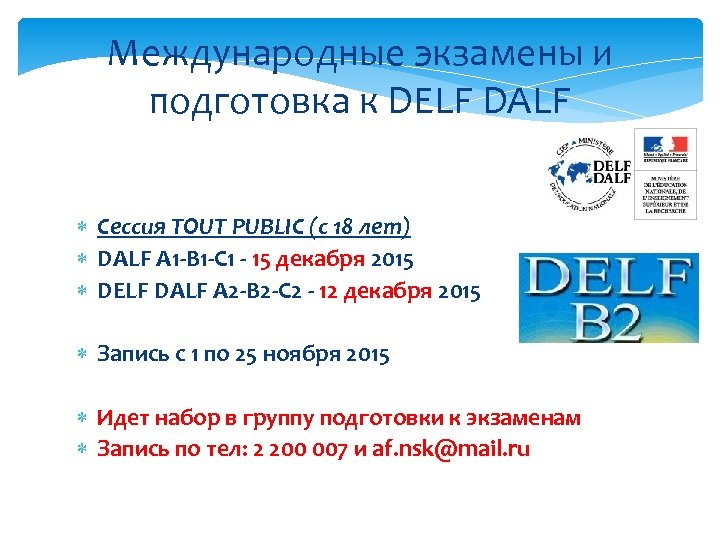 Международные экзамены и подготовка к DELF DALF Сессия TOUT PUBLIC (с 18 лет) DALF A 1 -B 1 -C 1 - 15 декабря 2015 DELF DALF A 2 -B 2 -C 2 - 12 декабря 2015 Запись с 1 по 25 ноября 2015 Идет набор в группу подготовки к экзаменам Запись по тел: 2 200 007 и af. nsk@mail. ru