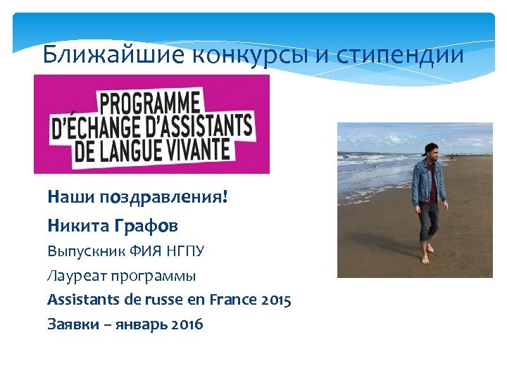 Ближайшие конкурсы и стипендии Наши поздравления! Никита Графов Выпускник ФИЯ НГПУ Лауреат программы Assistants de russe en France 2015 Заявки – январь 2016