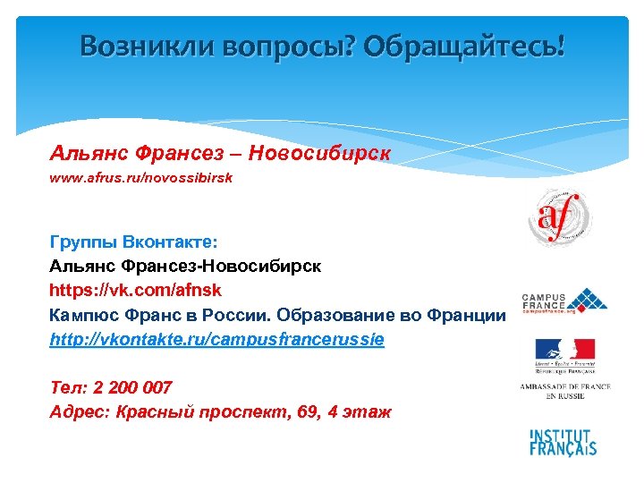 Возникли вопросы? Обращайтесь! Альянс Франсез – Новосибирск www. afrus. ru/novossibirsk Группы Вконтакте: Альянс Франсез-Новосибирск https: //vk. com/afnsk Кампюс Франс в России. Образование во Франции http: //vkontakte. ru/campusfrancerussie Тел: 2 200 007 Адрес: Красный проспект, 69, 4 этаж
