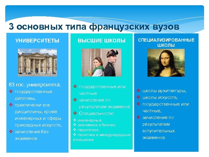 3 основных типа французских вузов УНИВЕРСИТЕТЫ 83 гос. университета, v государственные дипломы, v практически все дисциплины, кроме инженерных и сферы прикладных искусств, v зачисление без экзаменов ВЫСШИЕ ШКОЛЫ v государственные или частные v зачисление по результатам экзаменов v Специальности: v инженерные, v экономика и бизнес, v педагогика, v политика и международные отношения СПЕЦИАЛИЗИРОВАННЫЕ ШКОЛЫ v школы архитектуры, v школы искусств, v государственные или частные, v зачисление по результатам вступительных экзаменов
