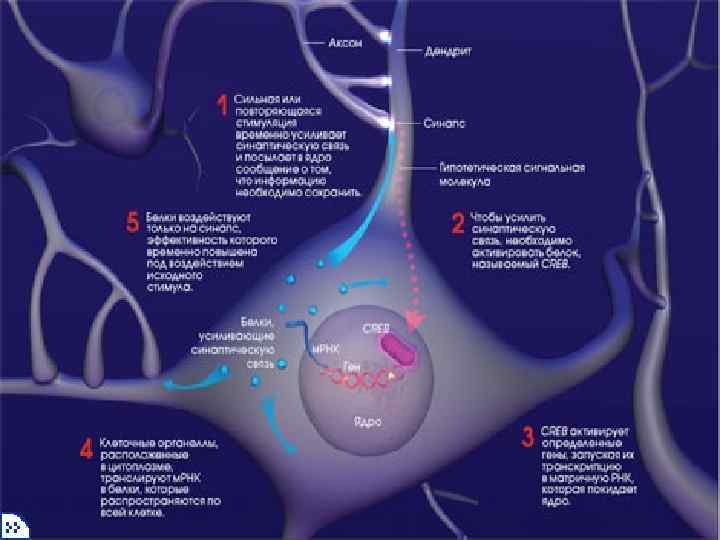 Молекулярный механизм забывчивости. Процесс запоминания в гиппокампе, куда поступает новая информация, происходит в три стадии: 1) нервный импульс вызывает высвобождение сигнальных молекул („молекул памяти“) из нервных окончаний аксона пресинаптического нейрона; 2) молекулы нейромедиатора связываются с рецепторами постсинаптического нейрона; 3) рецепторное связывание активирует фермент Са. МКII, участвующий в формировании памяти. PP 1 „выключает“ механизм запоминания: • PP 1 блокирует Ca. MKII, • этот фермент теряет способность посылать сигналы о начале синтеза белков, необходимых для формирования нервного импульса.