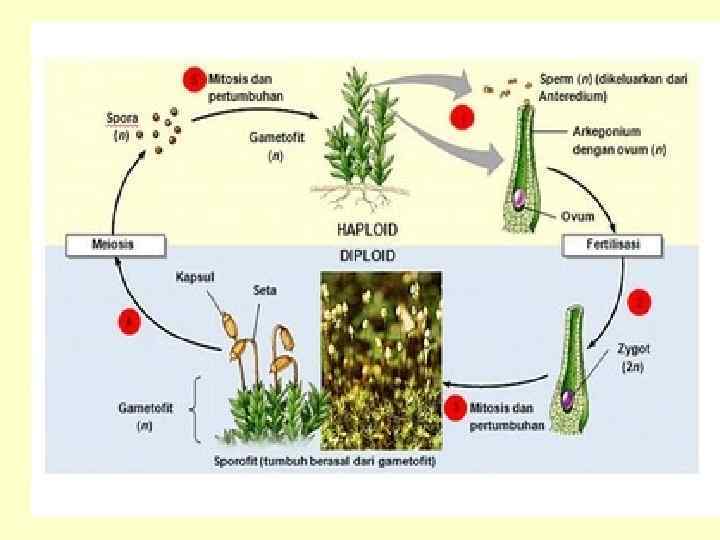 Чередование поколений • Таким образом, у моховидных наблюдается чередование, или смена поколений: полового поколения (гаметофита), представленного зеленым растением и бесполым (спорогоном) – развивающимся и живущим прямо на гаметофите.