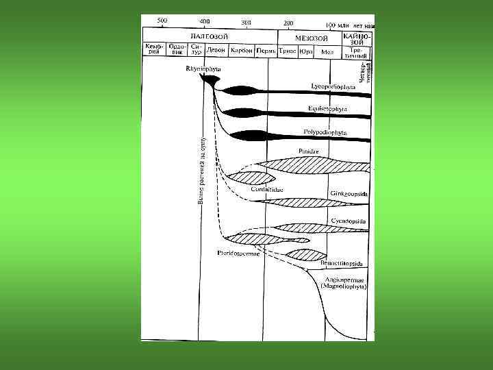 Общая характеристика • Появились на суше в конце силурийского периода, более 400 млн. лет назад • Первые наземные организмы небольших размеров и имели примитивное строение • Произошли от древних групп зеленых водорослей (главный фотосинетический пигмент а, вспомогательные – хлорофилл в и каротиноиды) • Моховидные и проптеридофиты произошли из водорослей независимо