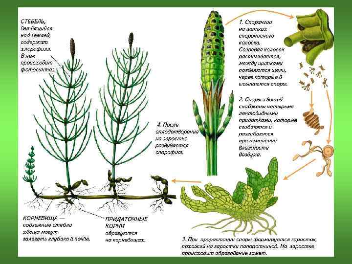 Отдел Хвощевидные (Equisetophyta) • споры имеют элатеры, лентовидные выросты. Из спор (физиологически различных) развиваются одно- или обоеполые заростки — гаплоидные гаметофиты, имеющие вид небольших зеленых рассеченных пластинок с ризоидами; • антеридии развиваются на концах лопастей заростков, а архегонии — в центральной части; архегонии созревают раньше антеридиев (на обоеполых заростках); • из зиготы сначала развивается зародыш, а из него — взрослый диплоидный спорофит.