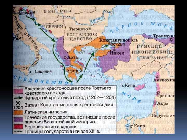4 -й крестовый поход (1199 -1204 гг. ) 4 -й крестовый поход организовывался для похода на Египет - основу арабского могущества. Победа в Египте могла избавить Святую землю от мусульманской угрозы. Однако Венеция воспользовалась ситуацией, чтобы направить крестоносцев не в Египет, а на Византию, ненависть к которой в Европе давно уже сравнялась с ненавистью к сарацинам. В 1202 г. крестоносцы взяли Константинополь, а европейские территории Византийской империи были разделены между европейскими феодалами. На ее месте возникла Латинская империя, просуществовавшая до 1261 г. , когда греки вернули себе Константинополь.