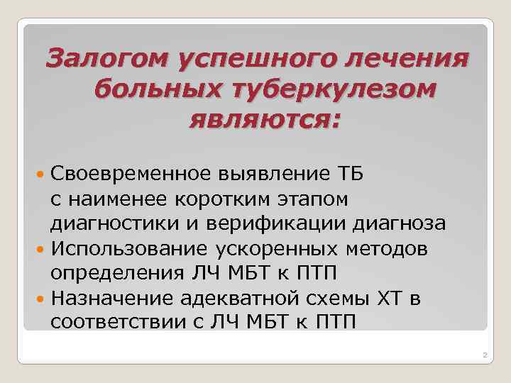 Залогом успешного лечения больных туберкулезом являются: Своевременное выявление ТБ с наименее коротким этапом диагностики и верификации диагноза Использование ускоренных методов определения ЛЧ МБТ к ПТП Назначение адекватной схемы ХТ в соответствии с ЛЧ МБТ к ПТП 2