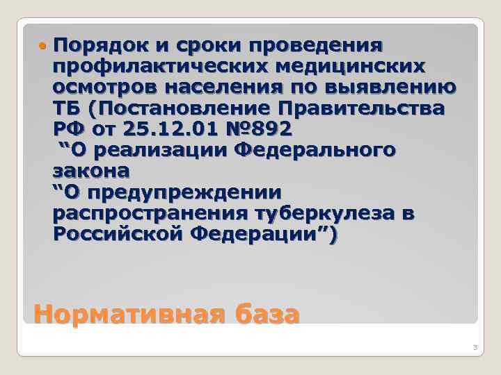Порядок и сроки проведения профилактических медицинских осмотров населения по выявлению ТБ (Постановление Правительства РФ от 25. 12. 01 № 892 “О реализации Федерального закона “О предупреждении распространения туберкулеза в Российской Федерации”) Нормативная база 3
