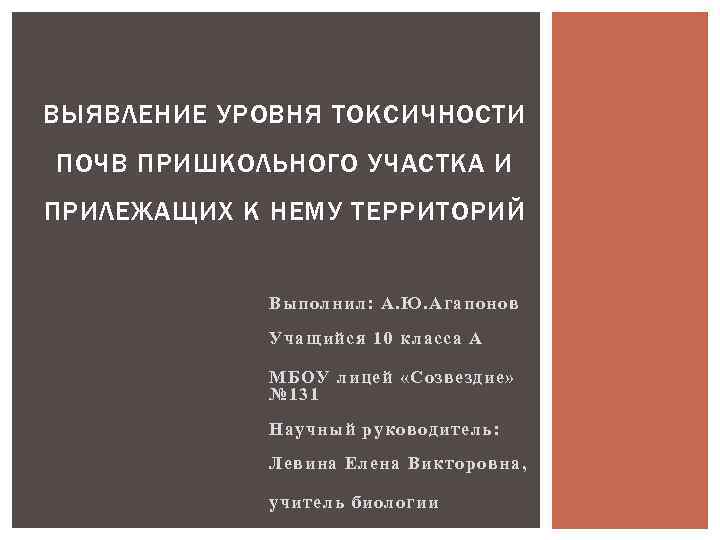 ВЫЯВЛЕНИЕ УРОВНЯ ТОКСИЧНОСТИ ПОЧВ ПРИШКОЛЬНОГО УЧАСТКА И ПРИЛЕЖАЩИХ К НЕМУ ТЕРРИТОРИЙ Выполнил: А. Ю. Агапонов Учащийся 10 класса А МБОУ лицей «Созвездие» № 131 Научный руководитель: Левина Елена Викторовна, учитель биологии