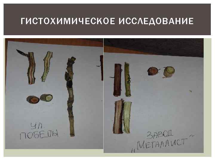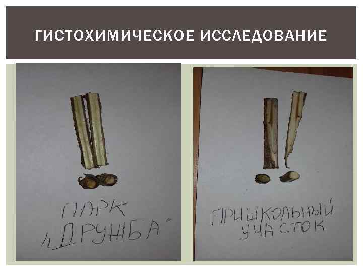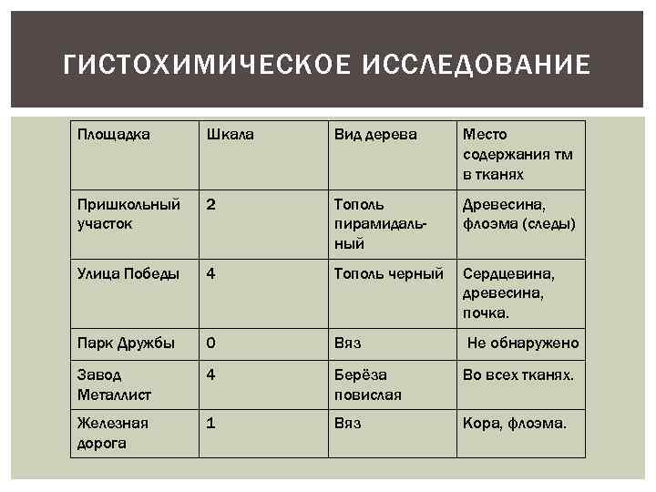 ГИСТОХИМИЧЕСКОЕ ИССЛЕДОВАНИЕ Площадка Шкала Вид дерева Место содержания тм в тканях Пришкольный участок 2 Тополь пирамидальный Древесина, флоэма (следы) Улица Победы 4 Тополь черный Сердцевина, древесина, почка. Парк Дружбы 0 Вяз Не обнаружено Завод Металлист 4 Берёза повислая Во всех тканях. Железная дорога 1 Вяз Кора, флоэма.