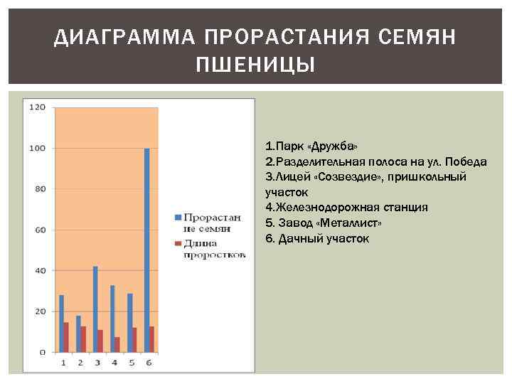 ДИАГРАММА ПРОРАСТАНИЯ СЕМЯН ПШЕНИЦЫ 1. Парк «Дружба» 2. Разделительная полоса на ул. Победа 3. Лицей «Созвездие» , пришкольный участок 4. Железнодорожная станция 5. Завод «Металлист» 6. Дачный участок