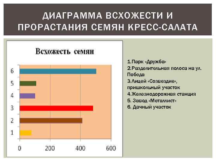 ДИАГРАММА ВСХОЖЕСТИ И ПРОРАСТАНИЯ СЕМЯН КРЕСС-САЛАТА 1. Парк «Дружба» 2. Разделительная полоса на ул. Победа 3. Лицей «Созвездие» , пришкольный участок 4. Железнодорожная станция 5. Завод «Металлист» 6. Дачный участок