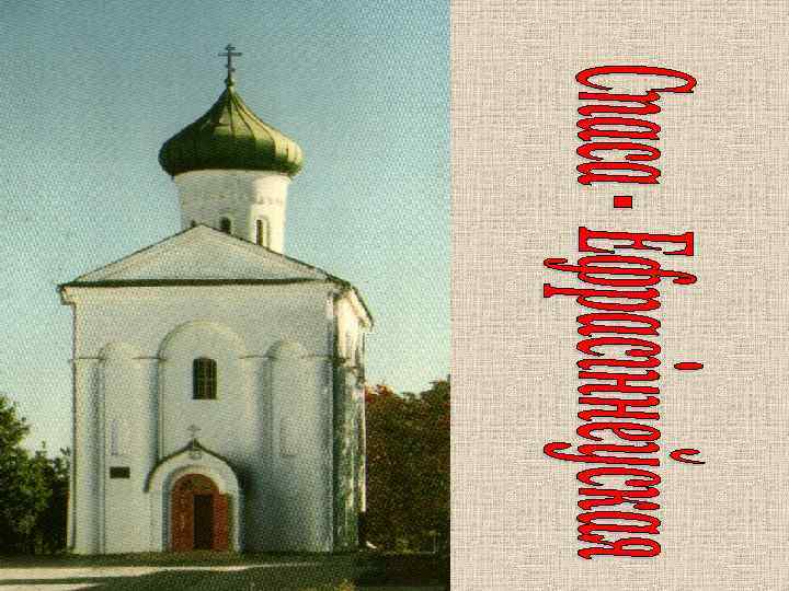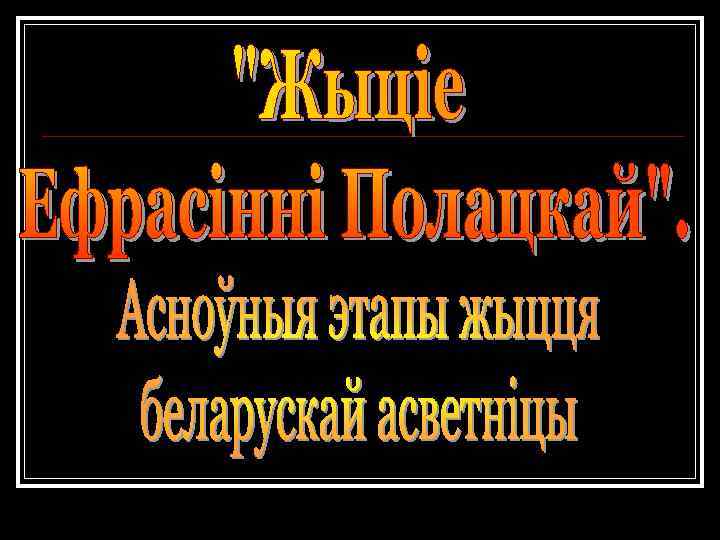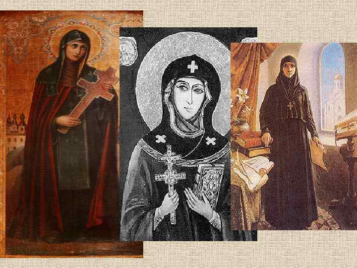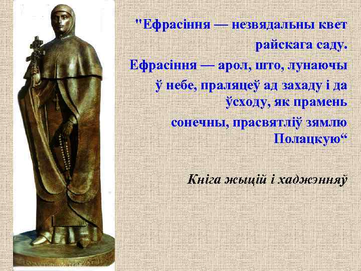 Гістарычны партрэт Ефрасінні Полацкай Рэлігійны дзеяч Асветніца Гуманіст Святая пайшла ў манастыр, была ігуменняй, адкрывала манастыры, будавала цэрквы, ажыццявіла паломніцтва ў Іерусалім перапісвала кнігі, адкрывала школы, вучыла людзей грамаце, выхоўвала дзяцей дапамагала бедным, вучыла жыць у любові і сяброўстве, папярэджвала ад варожасці паміж людзьмі прызнана праваслаўнай і каталіцкай цэрквамі нябеснай заступніцай зямлі беларускай
