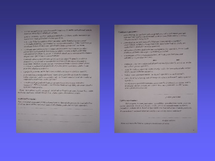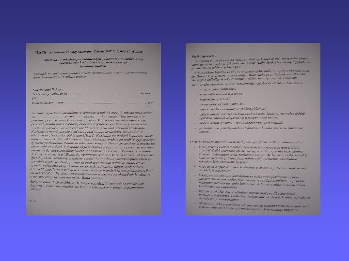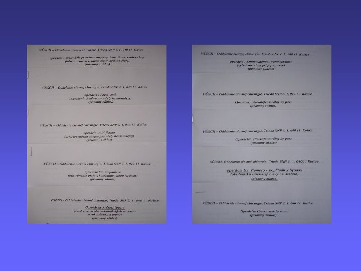 • Je oper. program v poriadku (údaje o pac. , dátum, podpis)? Vedú sa kompletné záznamy zdravotnej a ošetrovateľskej starostlivosti? • Sú záznamy o spotrebe zdravotného, šijacieho, a ŠZM v poriadku? • Je vypísaný a priložený zoznam setov pri každej operácii? • Je operačná kniha v poriadku? • Je vypísaný záznam o operácii v poriadku? • Sú pracovníci na OS ustrojení podľa predpisu? • Nosia zamestnanci identifikačné karty?