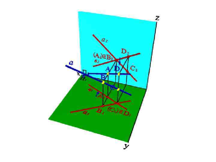 2. Пересекающие прямые расположены в общей для них проецирующей плоскости, например перпендикулярной фронтальной плоскости проекций (рис. 37). О взаимном расположении прямых, лежащих в этой плоскости, можно судить по одной горизонтальной проекции (А 1 В 1∩С 1 D 1Þ АВ∩СD).