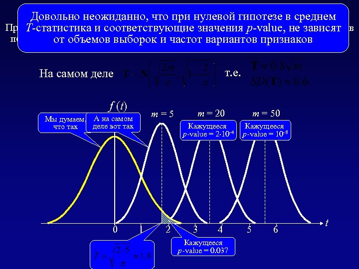 Более точное утверждение: Довольно неожиданно, что при нулевой гипотезе в среднем При нулевой гипотезе Т-статистика, сравнивающая число рисковых факторов Т-статистика и соответствующие значения p-value, не зависят по m признакам, не имеет стандартного распределения с нулевым средним! от объемов выборок и частот вариантов признаков т. е. На самом деле f (t) m = 5 Мы думаем, А на самом деле вот так что так 0 m = 20 Кажущееся p-value = 2 10 -4 1 2 3 4 Кажущееся p-value = 0. 037 m = 50 Кажущееся p-value = 10 -8 5 6 t